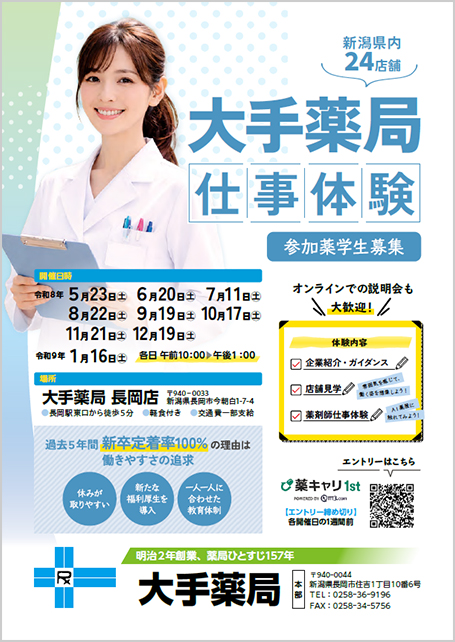 | 場所 | 大手薬局長岡店 940-0033 長岡市今朝白1-7-4 ※長岡駅東口から徒歩5分 ※希望に応じてオンラインでの説明会も実施可能です。 ※別途交通費一部支給 |